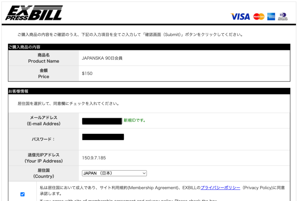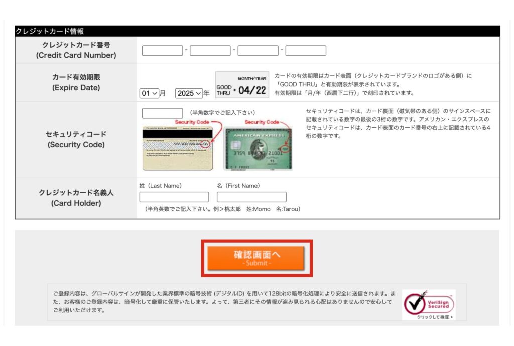 サイトはSSL(暗号化通信)に対応しているので、カード情報が漏れる心配はありません。